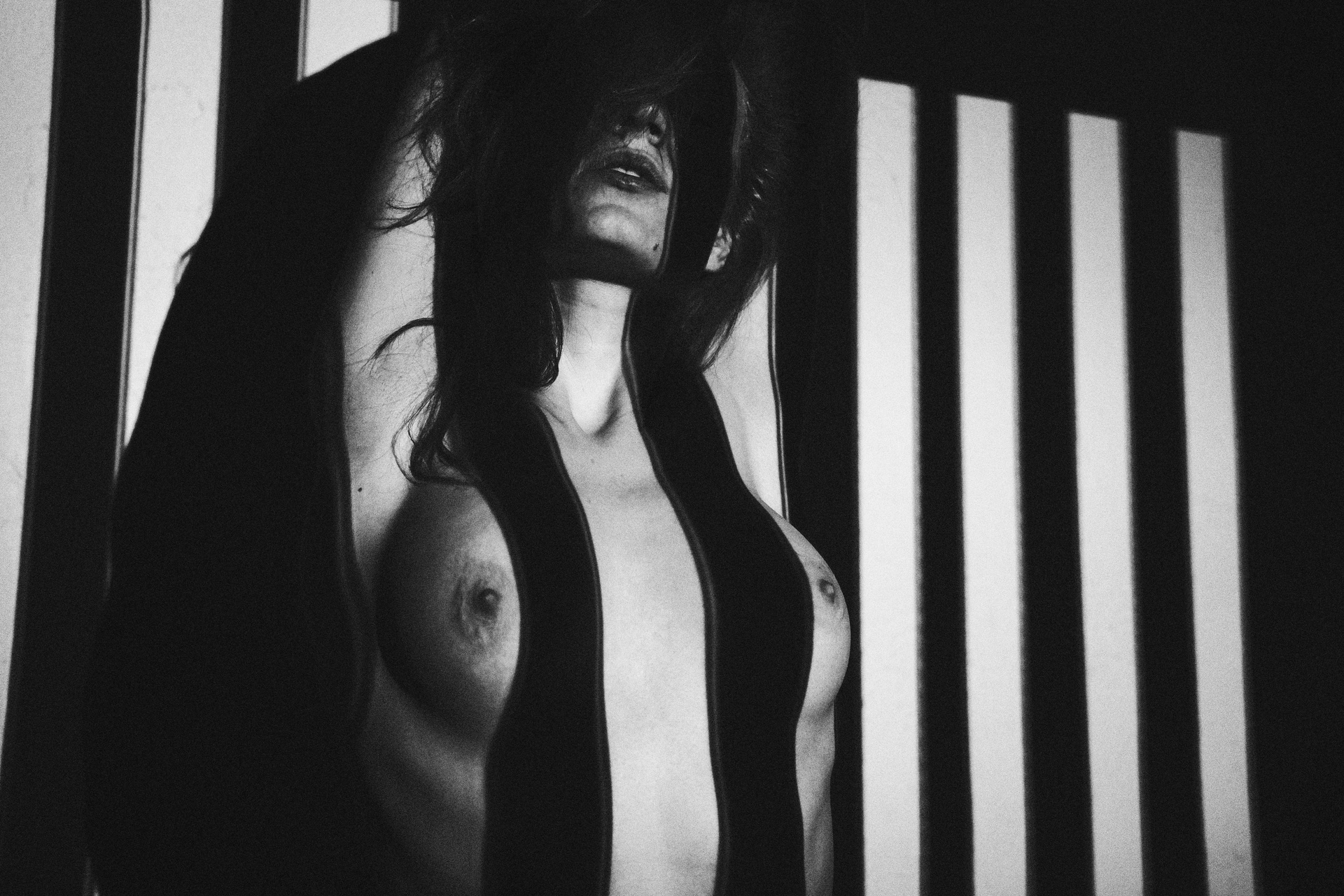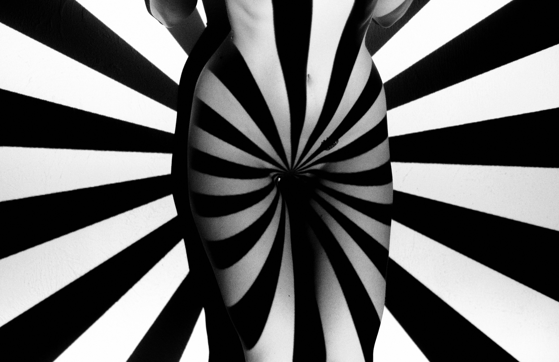 Свет становится кожей. Линии прочерчивают новую анатомию — временную, хрупкую, существующую только в момент съемки. Тело здесь — не объект, а экран. Полоса — не препятствие, а способ увидеть иначе.